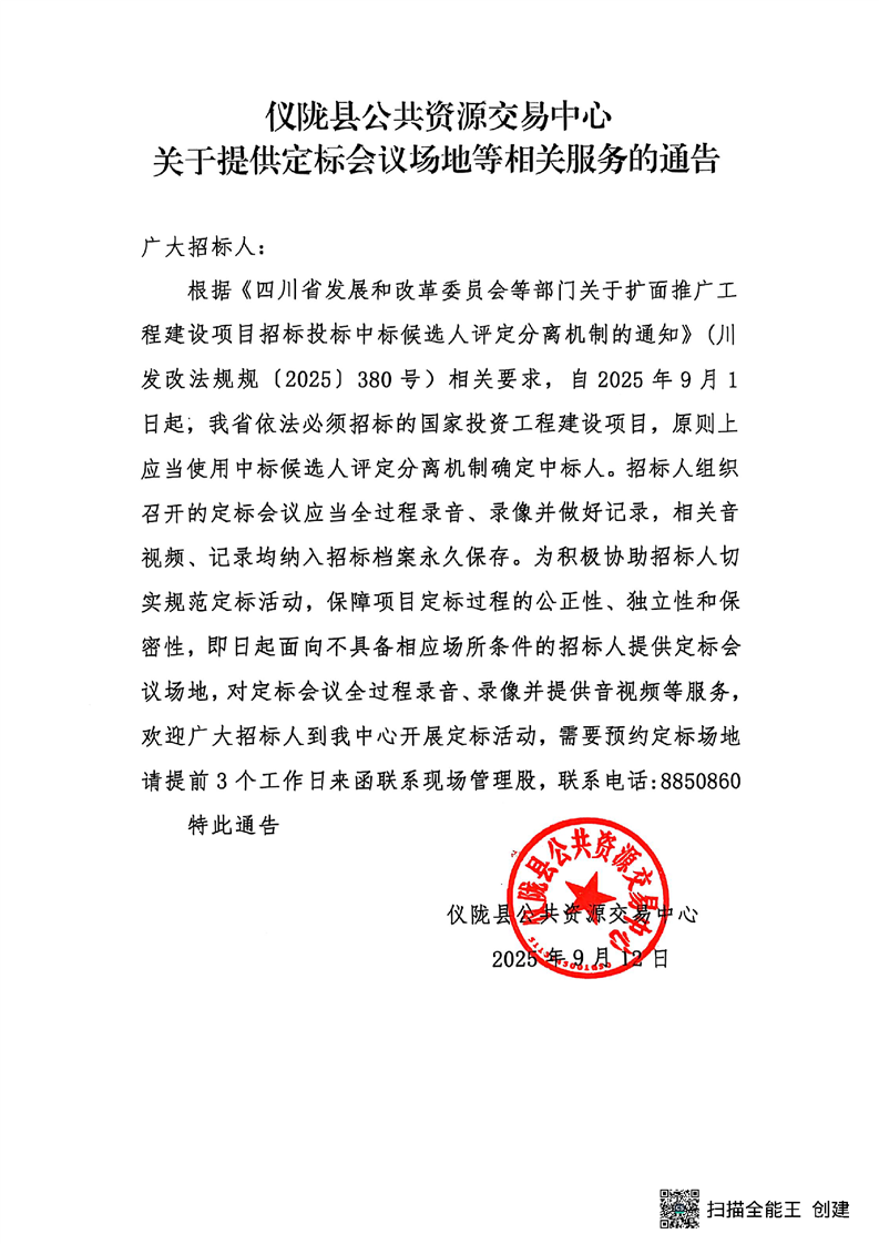 儀隴縣公共資源交易中心關(guān)于提供定標(biāo)會議場地等相關(guān)服務(wù)的通告